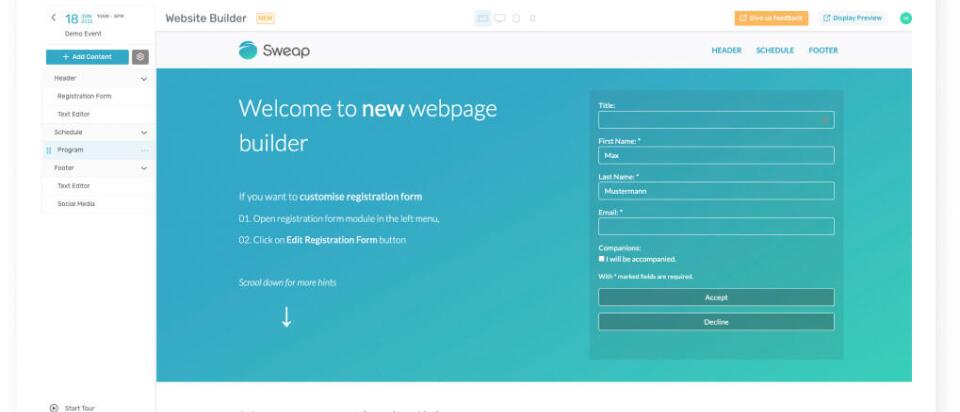 Vorbei sind die Zeiten frustrierender statischer Seiten, die keinen Raum für Flexibilität lassen. Vorbei sind auch die Zeiten hässlicher, unintuitiver Web Builder, in denen sich die Nutzer*innen in den schlecht erklärten, unübersichtlichen Optionen verlieren. Der Sweap Web Builder ist die perfekte Goldlöckchen-Lösung für vielbeschäftigte Event-Profis, die stolz auf ihre Arbeit sind.