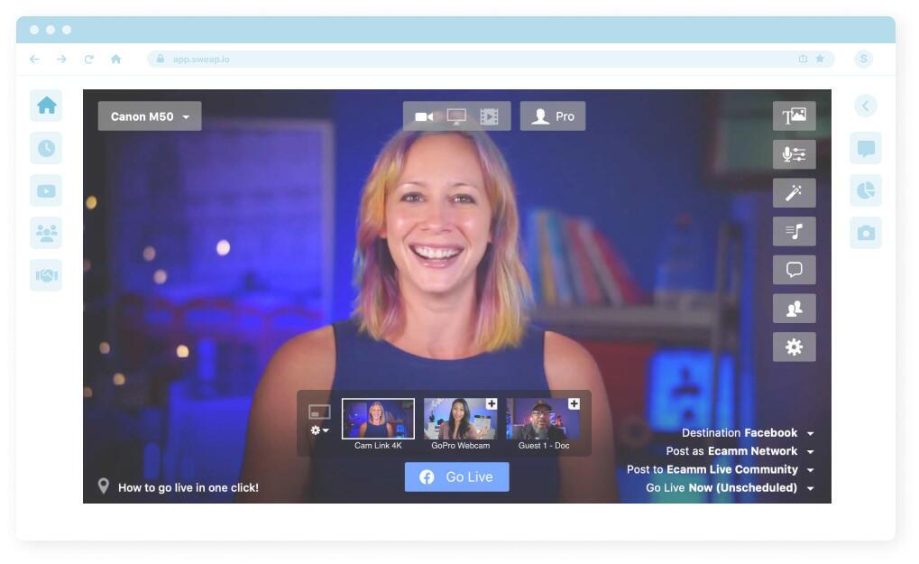 Ecamm Live ist ein großartiges und intuitives Tool für Live-Streaming und Videoproduktion. Du kannst damit ein professionelles, einfaches und anpassbares Video erstellen. Außerdem kannst du Interviewgäste einladen, Videoclips einspielen, deinen Bildschirm teilen usw.