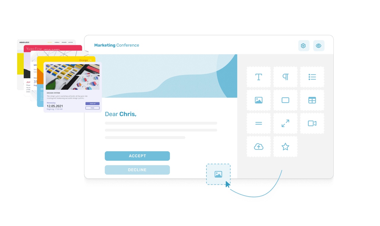 To keep your event invitation design efficient and flexible, consider using a dynamic email builder. This kind of tool allows you to easily customize elements - like layout, colors, fonts, and logos and ensures they always align with your brand. A dynamic email builder also lets you store designs and assets centrally, simplifying team collaboration and reinforcing brand recognition.